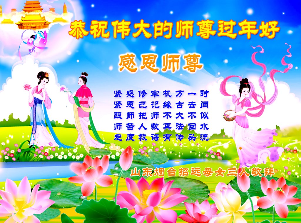 祝师父过年好! 弟子一定要做好三件事,谢谢师父慈悲苦度!弟子感恩不尽。 山东烟台招远母女三位大法弟子恭祝慈悲伟大的师尊过年好!