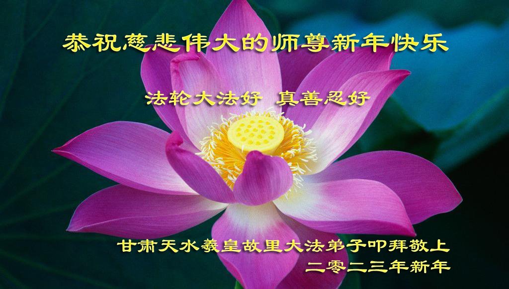 一年复始万象新 感恩师尊转法轮 法正心正乾坤正 正天正地正众生 弟子谨遵师教诲 同化法光真善忍 正念正行慈悲意 助师正法救世人 甘肃天水羲皇故里大法弟子叩拜合十 二零二三年新年 甘肃兰州大法弟子恭祝慈悲伟大的师尊过年好!