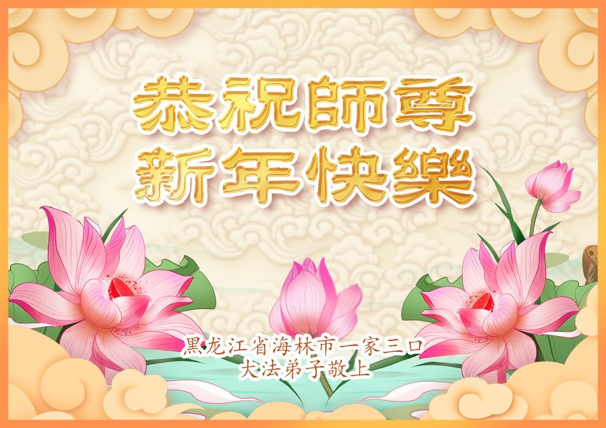 尊敬的师父好!感谢师父慈悲救度! 弟子无法用语言表达恩师的慈悲苦度,弟子唯有做好三件事 报答师恩。 谢谢师父! 弟子叩拜 黑龙江省牡丹江市海林市一家三位大法弟子恭祝师尊新年快乐!