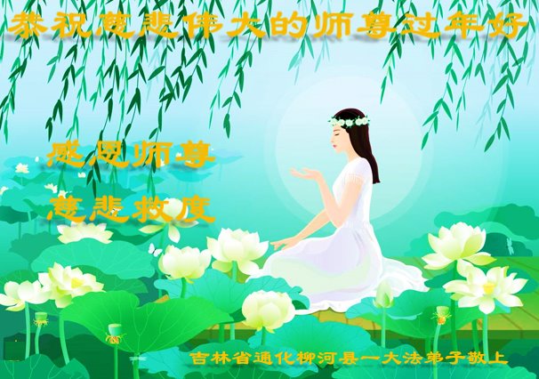 恭祝慈悲伟大的师尊过年好! 弟子感恩师尊慈悲救度!在这大劫当前,正法向人间过度之际。弟子更当勇猛精進,多救人,同化大法“真、善、忍”。让师尊能多一份欣慰,少一份牵挂,谢谢师尊! 柳河大法弟子跪拜师尊 吉林省通化柳河县一大法弟子恭祝慈悲伟大的师尊过年好!