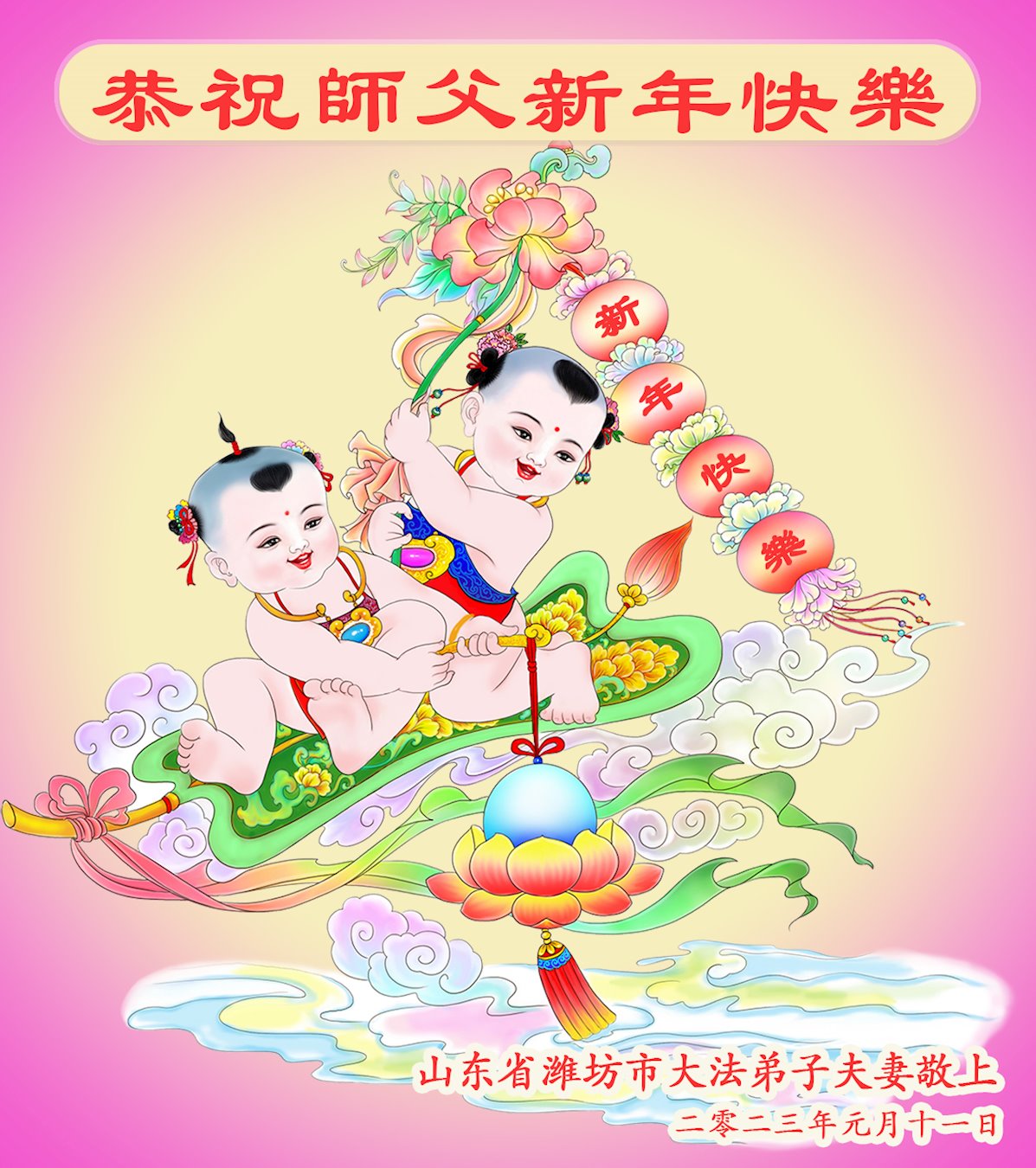 【明慧网二零二三年一月十九日】 山东省潍坊市潍城区大法弟子夫妻恭祝师父新年好!