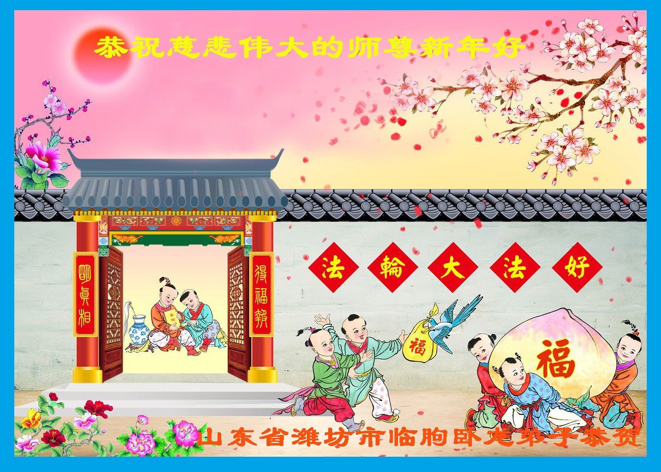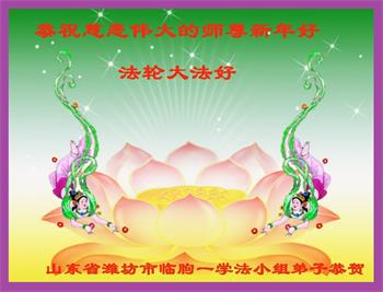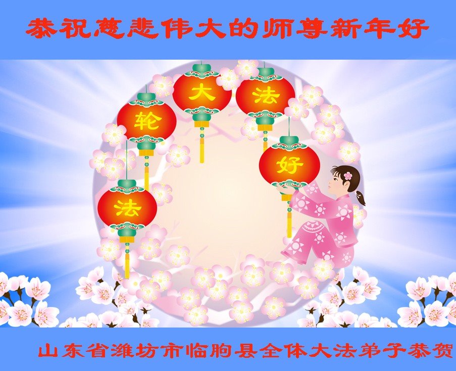 山东潍坊临朐一全家大法弟子值此新年之际向师尊问好!恭祝慈悲伟大的师尊新年快乐! 合十 山东潍坊临朐一全家大法弟子敬上 山东省潍坊市全体大法弟子恭祝慈悲伟大的师尊新年快乐!