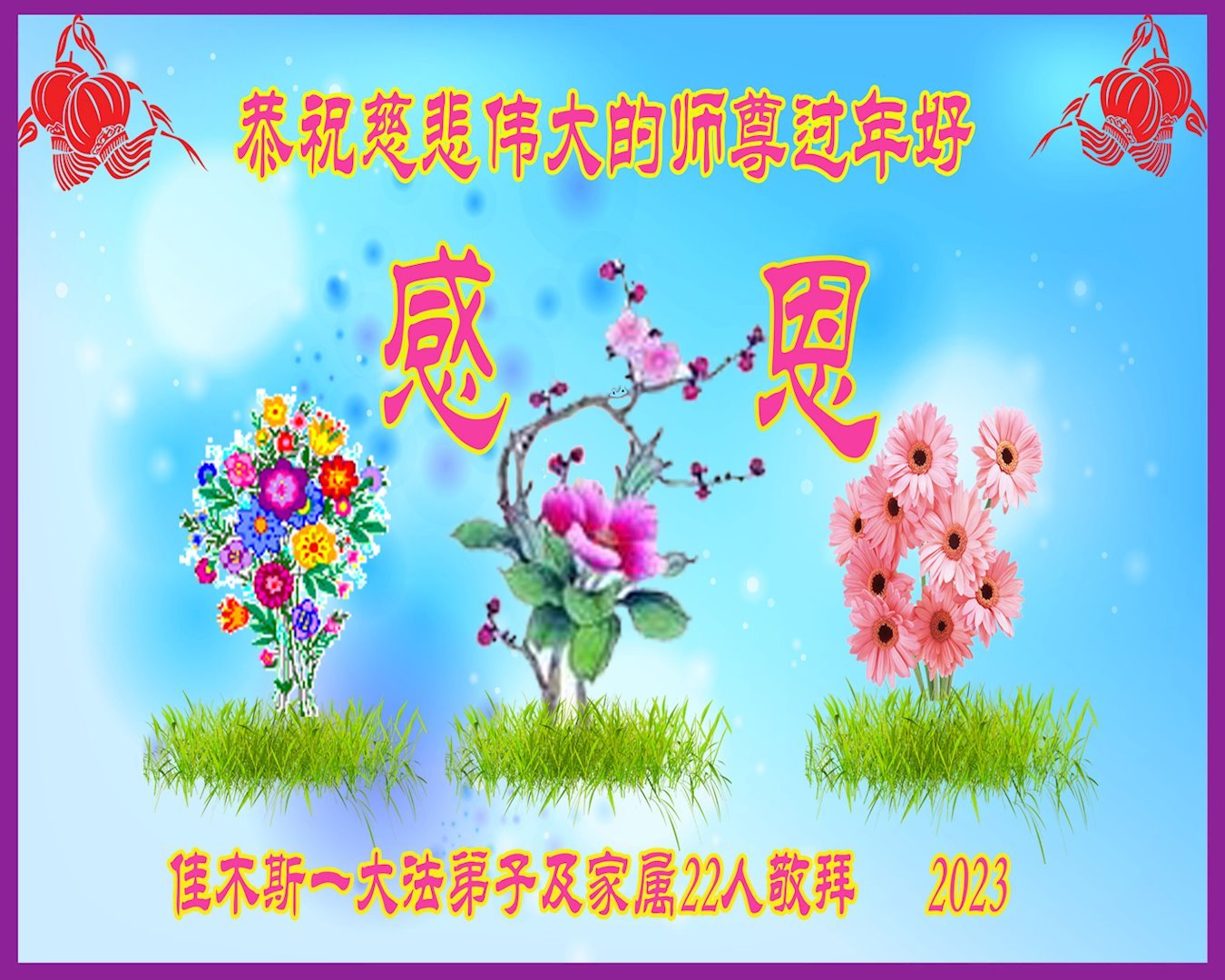 黑龙江省佳木斯市一大法弟子及家属22人恭祝慈悲伟大的师尊过年好!