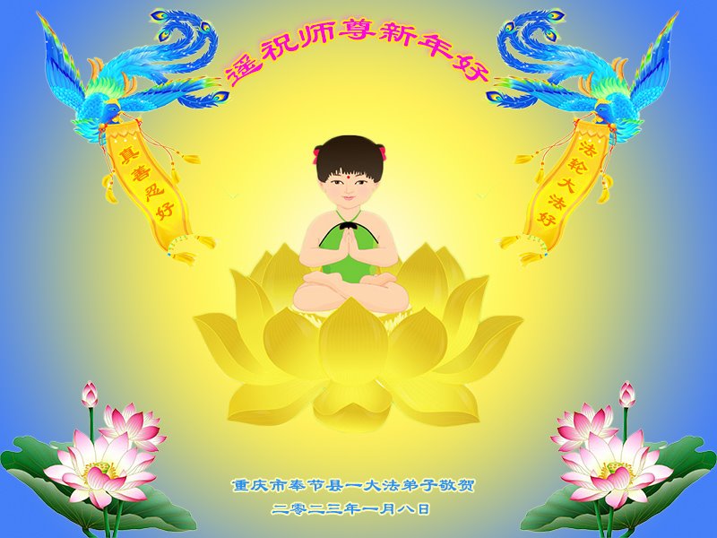 恭祝伟大的师父过年快乐! 感恩师父慈悲救度! 在我的人生当中最幸运、最值得高兴的事情是:我修炼了万古不遇的法轮大法了,我有一位慈悲伟大的师父,是您把我从地狱中第二次捞起、洗净,教我如何按照真、善、忍法理去做人,去做更好的人。在返本归真的修炼路上,助师正法,救度众生。我要从现在开始舍尽一切传真相,唤醒世人,随师还。 重庆市一大法弟子敬上 重庆大法弟子恭祝师尊新年快乐!