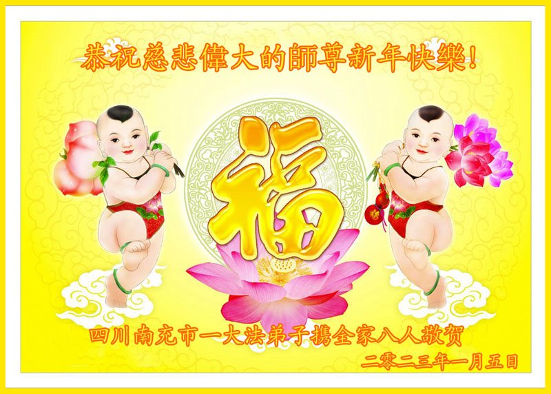 四川南充市一大法弟子携全家八人恭祝师尊新年快乐!