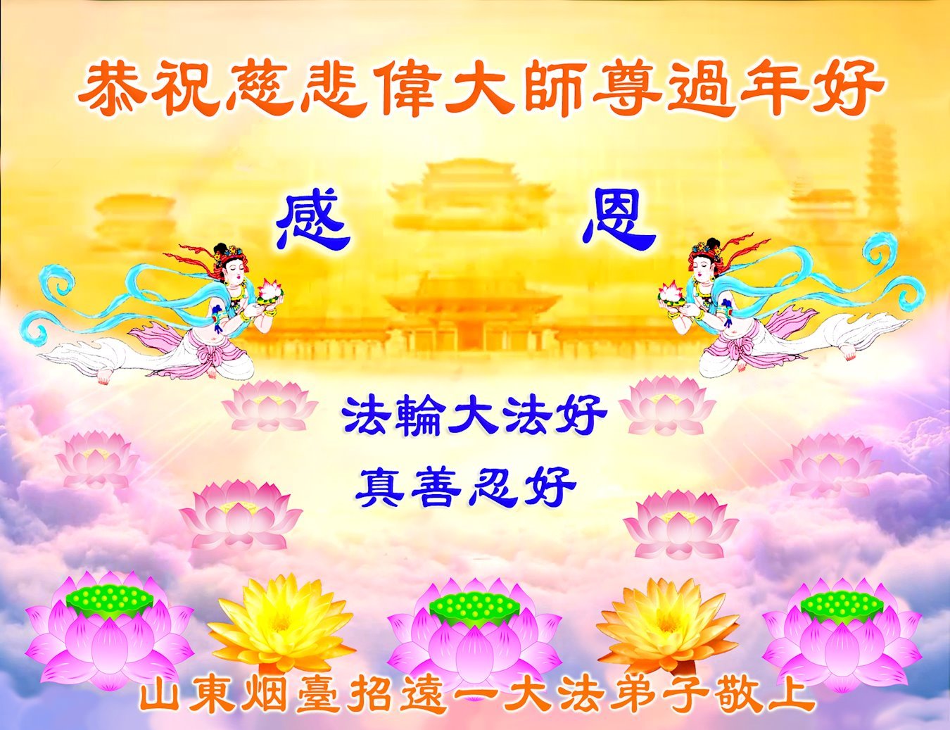 穷宇宙之所有无法描述师尊的佛恩浩荡,用尽人类语言无法表达弟子的感恩之心。弟子能够生于中土,得此人身,并得师尊亲传宇宙大法,使生命有了洗净罪业并获得提升的机缘,实乃万幸!感恩师尊的慈悲救度,值此辞旧迎新之际,请允许弟子们以最真挚虔诚的心恭祝师尊新年好!师尊新年快乐! 山东烟台市莱阳市全体大法弟子 山东烟台莱州市一大法弟子恭祝师尊过年好!