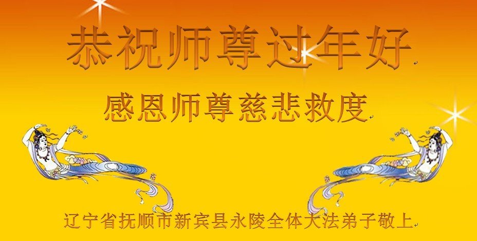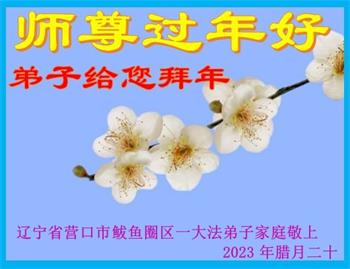 师尊过年好!我们全家给您拜年! 我们这个大法弟子家庭,大多都参加过您的讲法学习班,听到过您的亲自讲法。师尊,我们想念您,我们盼师归。 在新的一年里,我们要更加精進,做好“三件事”,多救众生。让师父多一份欣慰,少一份操劳,以谢师恩。 辽宁省营口市鲅鱼圈区一大法弟子家庭敬上 2023年1月11日(腊月二十) 辽宁省抚顺市新宾县永陵全体大法弟子恭祝师尊过年好!