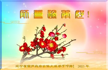 仰望星空,众星闪耀,那是慈悲伟大的师尊付出巨大的法力与承受为弟子们打造的美丽家园。二零二二多魔难,旧势借疫泼脏水,在师尊的保护下走过一难又一难,弟子们更加信师信法,坚定跟随师尊,兑现誓约。师尊为弟子们操碎了心,感恩师尊为弟子们付出的一切一切! 师尊您辛苦了!师恩浩荡!恭祝师尊新年好 严冬黑夜逃之夭, 春意曙光悄然到; 寒梅芬芳乘云飘, 恭祝师尊新年好。 美丽家园七彩耀, 感恩师尊苦打造; 二零二三步步高, 助师正法涌前潮。 辽宁省葫芦岛市绥中县全体大法弟子恭祝慈悲伟大的师尊过年好!