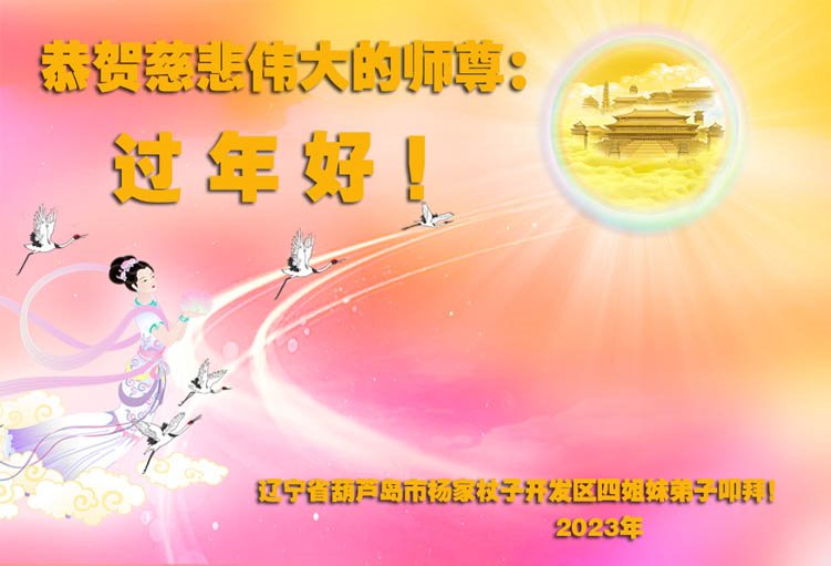 辽宁省葫芦岛市杨家杖子开发区四姐妹弟子恭祝师尊中国新年快乐! 师尊:您辛苦了!恭祝慈悲伟大的师尊新年快乐!弟子们无尽感恩师尊的苦度! 弟子们相互促進,共同精進,修好自己,兑现誓约,不辜负师尊的苦度和众生的期望。 2023年1月13日 辽宁省葫芦岛市绥中县全体大法弟子叩拜师尊过年好!