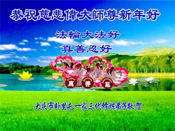 黑龙江省大庆市卧里屯一家三代修炼的全体大法弟子恭祝慈悲伟大师尊新年好!
