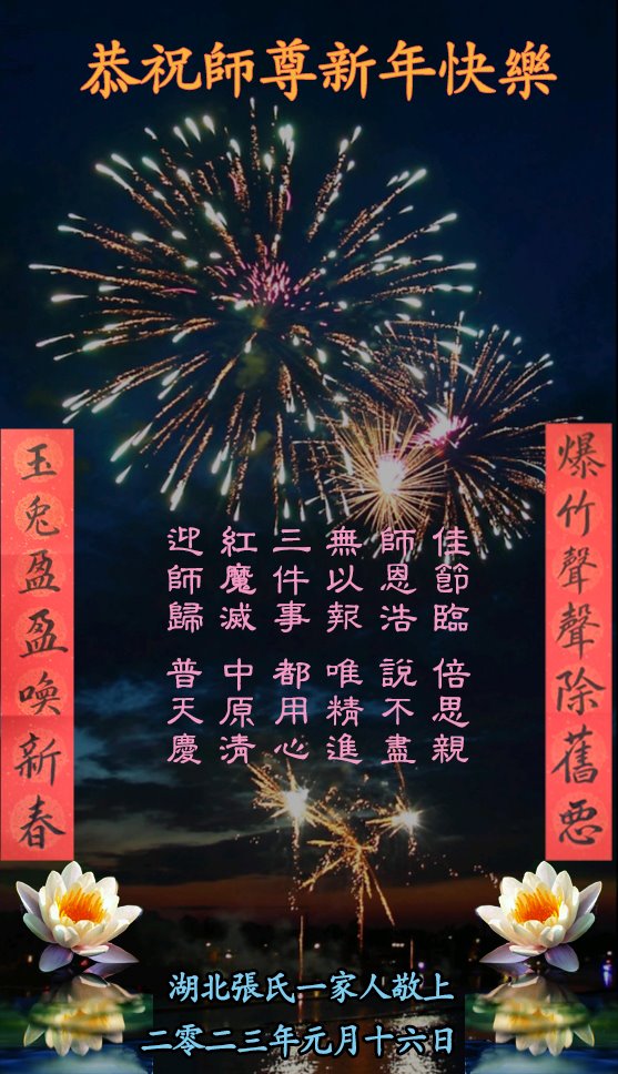 给师尊拜年 佳节临,倍思亲。 师恩浩,说不尽。 无以报,唯精進。 三件事,都用心。 红魔灭,中原清。 迎师归,普天庆。 湖北张氏一家人敬上 二零二三年元月十六日 湖北省黄石市全体大法弟子恭祝慈悲伟大的师尊过年好!