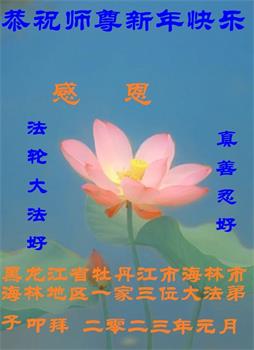 师尊辛苦了!感恩师尊慈悲救度! 在新的一年里,弟子会更加精進,做好三件事,多救人。 黑龙江省勃利县八名大法弟子敬上 二零二三年一月十八日 黑龙江省七台河市一大法弟子及全家人恭祝师尊新年好!