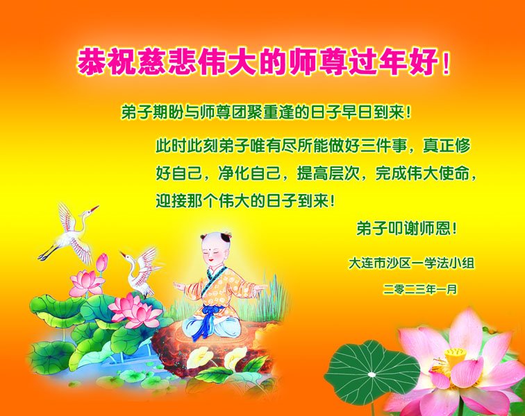 辽宁省大连沙区一学法小组大法弟子恭祝慈悲伟大的师尊过年好!