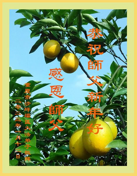 感谢师父的慈悲保护。弟子只有勇猛精進,做好三件事,跟师父回家。 重庆永川婆、孙大法弟子恭祝师父新年快乐!