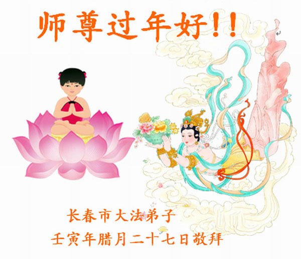 在这节日即将到来之际,弟子怀着无比感恩的心情叩拜师尊。愿师尊过年好! 弟子会时刻铭记师尊的教诲修好自己救度众生,圆容一切师尊所要。愿师尊多一些欣慰,少一些操劳。 弟子叩拜师尊!合十 吉林省长春市榆树市新立乡一大法弟子及全家恭祝师尊大年好!