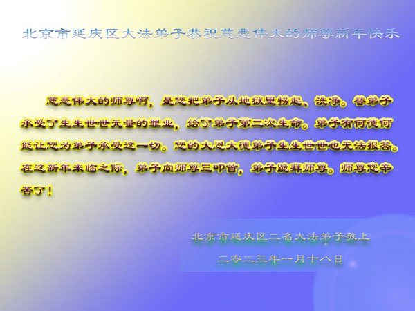 师父好,给师父拜年了!在这最后正法的日子里,弟子们要努力做好三件事。跟师父回家。 北京市大兴区大法弟子恭祝师尊过年好!