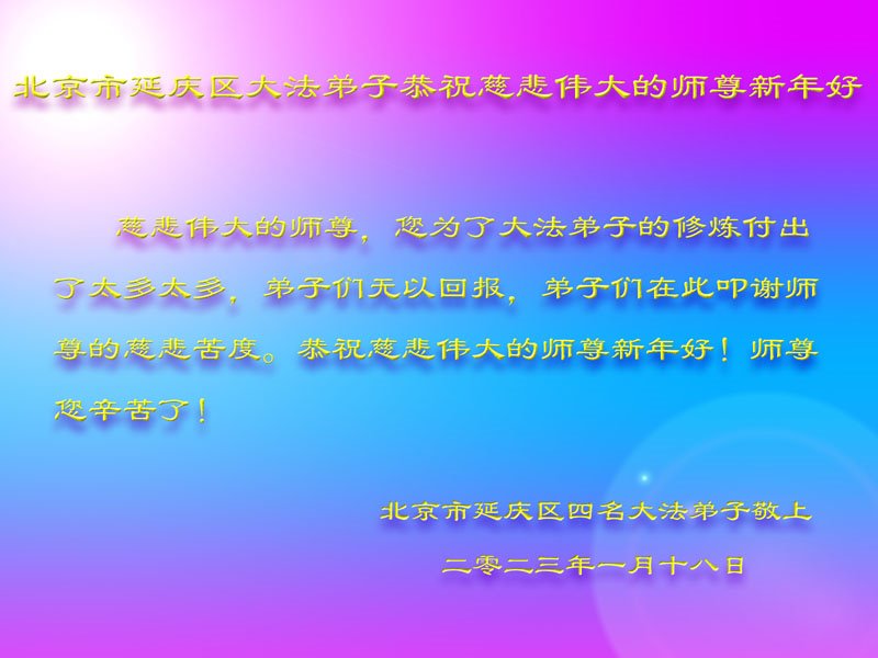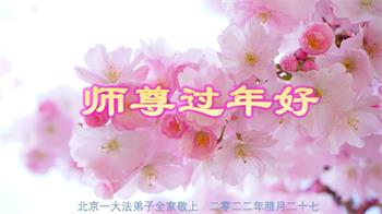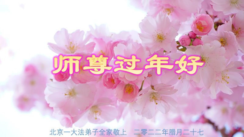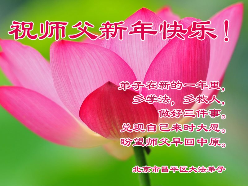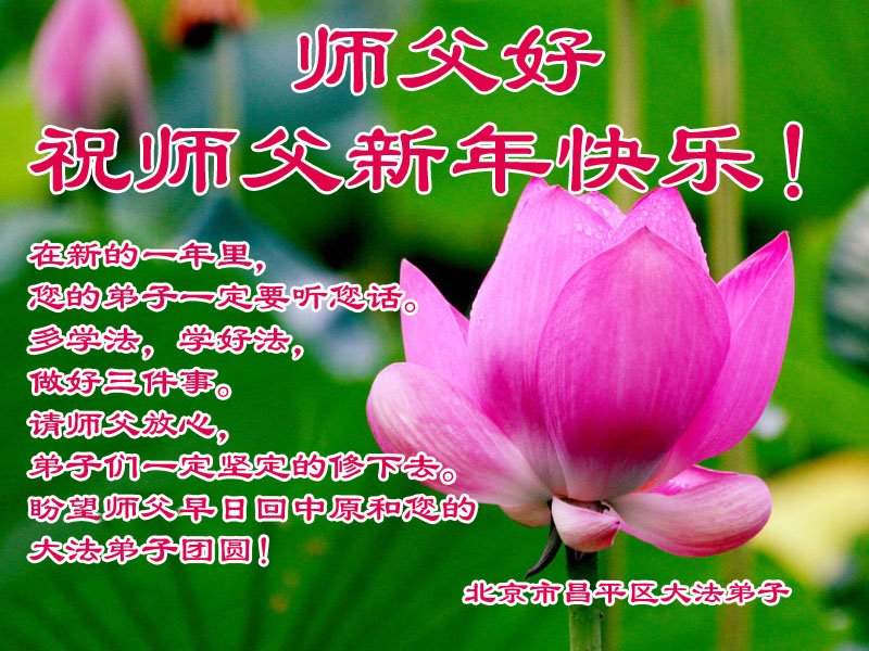新年到来之际我们给师尊拜年!恭祝伟大慈悲的师尊过年好! 我们一定听师尊的话,多学法,多救人,做好三件事,让师父放心。 北京市昌平地区一大法弟子敬祝师尊新年快乐!