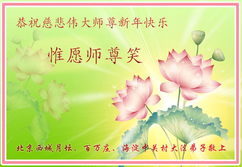弟子一定坚定正念,信师、信法!师尊给予的一切都是最好的安排。跪谢师父的慈悲救度!盼师父能早日回国! 北京西城月坛、百万庄、海淀中关村大法弟子恭祝师尊新年快乐!
