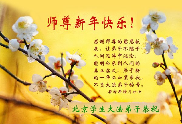师父过年好!师父您辛苦了! 弟子一定坚定不移信师信法,努力做好三件事,去掉一切执着,跟师父回家!弟子敬上 北京学生大法弟子恭祝师尊新年快乐!