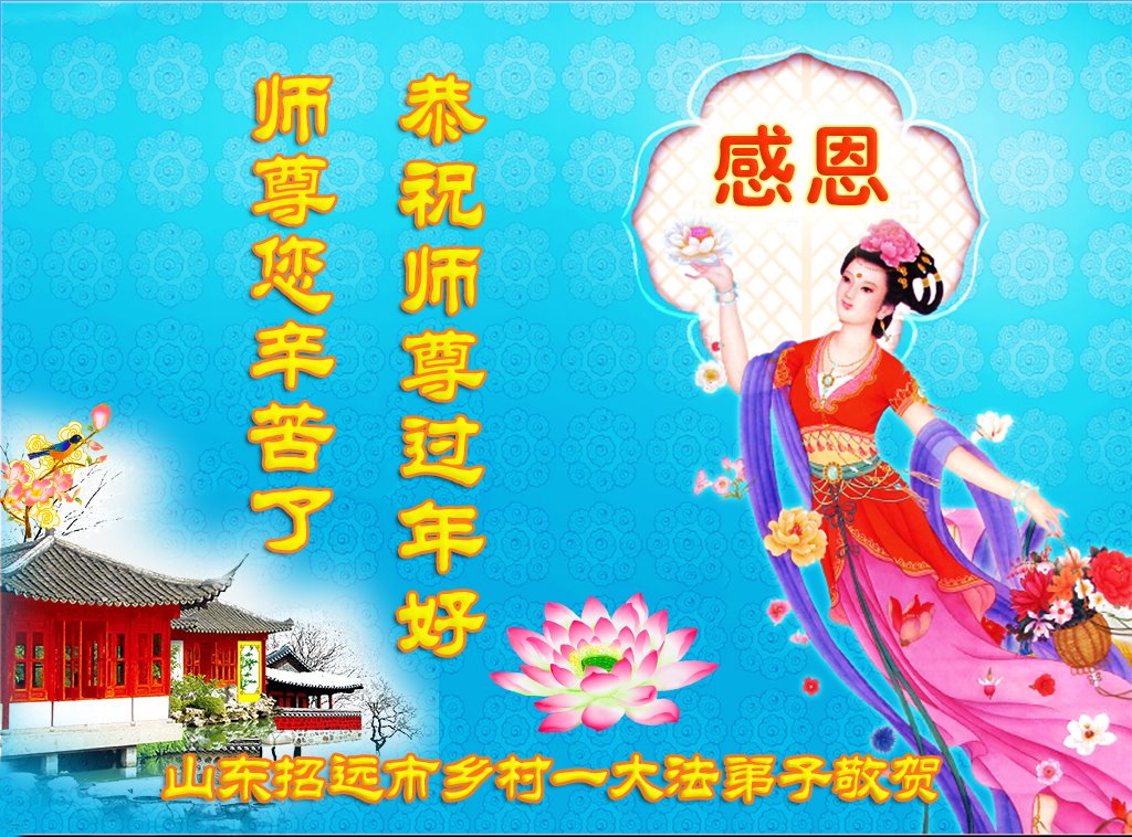 感恩师尊佛恩浩荡救度苍宇!感恩师尊慈悲救度众生!感恩师尊一路看护! 我们一定精進实修,修好自己救度众生。叩拜师尊!恭祝慈悲伟大的师尊新年快乐! 山东省滨州市惠民县乡村大法弟子恭祝慈悲伟大的师尊过年好!