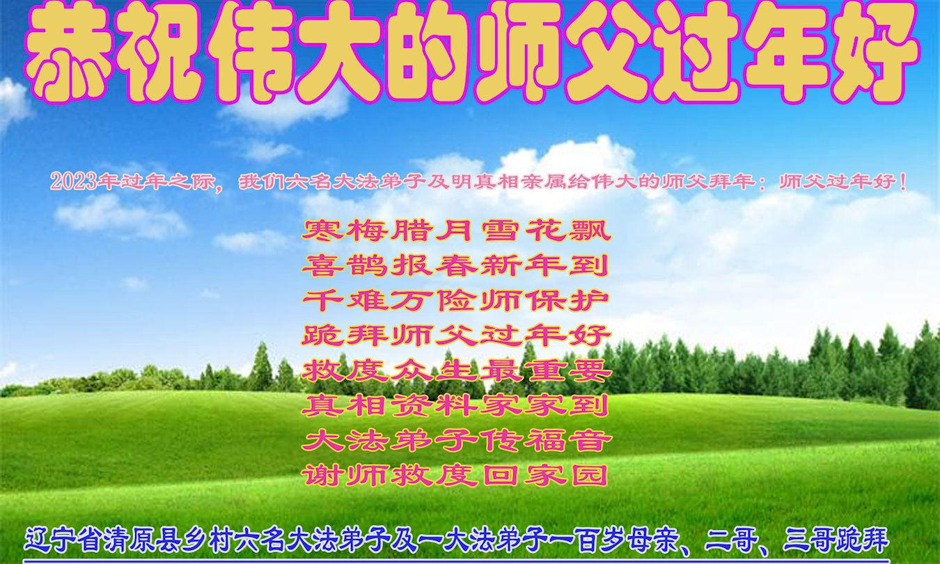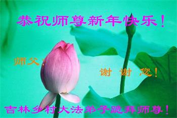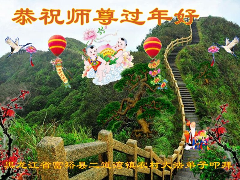 | 【明慧网二零二三年一月二十一日】(明慧网记者综合报道)迎新春,过新年,生活在中国大陆大江南北的乡村大法弟子,感谢李洪志师父亲传大法和步步看护,真善忍的法理开启大法弟子们的慈悲和智慧,使道德回升,乡镇农村大法弟子们在加紧证实大法、传福音。 在中国传统大年到来之际,淳朴的乡村大法弟子们传来贺词,敬拜师尊过年好! 湖北省黄冈市浠水县农村大法弟子写道:大陆疫情泛滥,天灭中共在即,我们浠水县全体农村大法弟子抓紧最后时间,兑现自己的誓约,做好大法弟子该做的三件事,多救世人。 山东省蒙阴县相邻的两个乡村的大法弟子们表示:我们两个村的大法弟子以法为师,比学比修,相互促進,共同提高,用心做好三件事,多救人,兑现誓约。恭祝师父新年快乐! 山东省烟台招远市乡村一大法弟子恭祝伟大的师尊过年好!