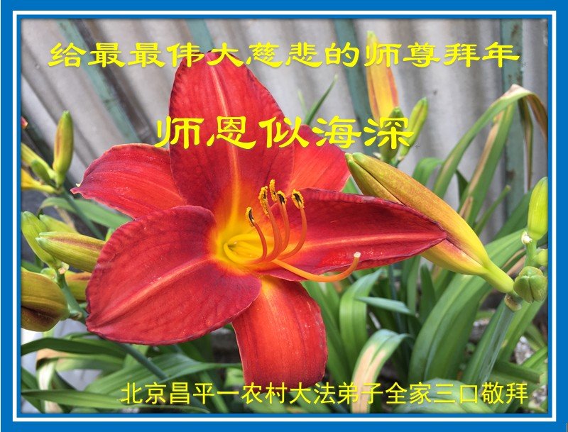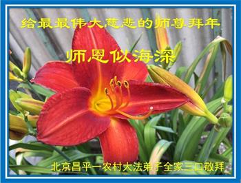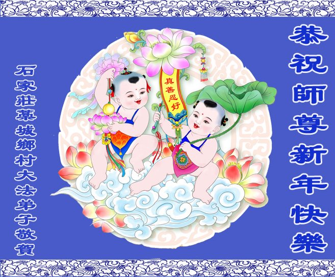 新年来临之际,弟子更加想念师尊,恭祝师尊新年快乐!同时也代表全家人以及明白真相的世人恭祝师尊新年快乐! 弟子一定跟随师父走好最后的正法路!多救人,快救人!跟随师父回归天国盛府! 北京昌平一农村学法小组给师尊拜年!