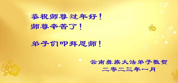 | 【明慧网二零二三年一月二十一日】2023年中国新年到来之际,中国大陆各民族大法弟子们恭祝李洪志师父新年好!更盼望师父早日回国和弟子们团聚。大法弟子在贺词中写道:“我们时时沐浴在佛恩浩荡中,因为有大法导航,我们不再迷茫;因为有大法指点迷津,我们充满智慧和理性;因为有大法护佑,我们幸福无比。我们时时盼着您早日回中原。” 以下是部份来自中国各省、自治区的回族、蒙古族、满族、锡伯族、维吾尔族、朝鲜族、壮族、布依族、苗族、彝族等各民族大法弟子敬致师尊的新年贺信。 贵州黔西南布依族苗族自治州全体大法弟子恭祝师尊过年好!