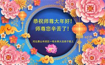 师父过年好! 落入迷中幸遇师尊佛恩浩荡!只有努力,多救众生,师父辛苦了! 谢谢师父!谢谢师父! 河北唐山市滦州一大法弟子恭祝师尊过年好!