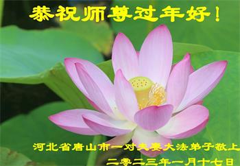 恭祝慈悲伟大的师尊过年好! 在正法的最后时刻,时间紧迫,弟子们一定多学法,学法入心,修去人心执着,同修间配合好,多发正念,做好救人的事,整体提高,整体升华,听师尊的话,越最后越精進,请师尊多一些欣慰,少一些操劳。 唐山市古冶区一学法小组所有大法弟子敬上 2023年1月 恭祝慈悲伟大的师尊新年快乐! 时间飞逝,转眼又是新的一年。弟子一家人,一定听师尊的话,精進实修,做好三件事,不辜负师尊的期望。再一次恭祝师尊新年好! 唐山市古冶区全家大法弟子敬上 恭祝慈悲伟大的师尊过年好! 弟子恭祝慈悲伟大的师尊二零二三年新年快乐!谢谢师尊时时对弟子的保护和正念的加持。感谢师尊的慈悲救度。弟子想念师尊! 弟子携全家十一口跪拜师尊!再一次恭祝师尊新年好!法轮大法好!真善忍好! 唐山市古冶区俩大法弟子携全家敬上 河北唐山一对夫妻大法弟子恭祝慈悲伟大的师尊过年好!