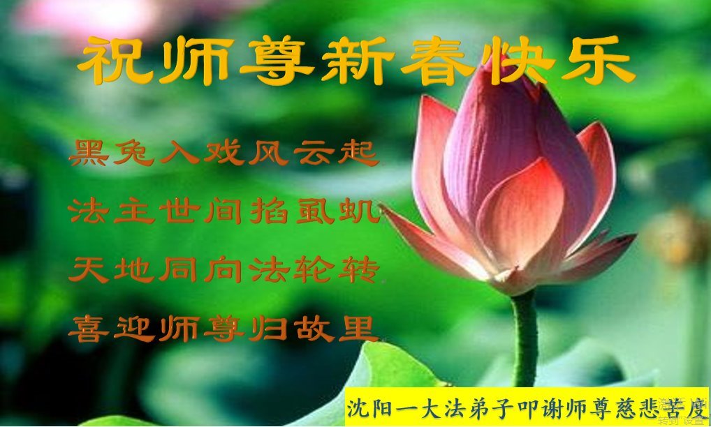 祝师尊新年快乐! 黑兔入戏风云起 法主世间掐虱虮 天地同向法轮转 喜迎师尊归故里 沈阳一弟子叩谢师尊慈悲苦度! 辽宁省沈阳大法弟子恭祝师尊过年好!