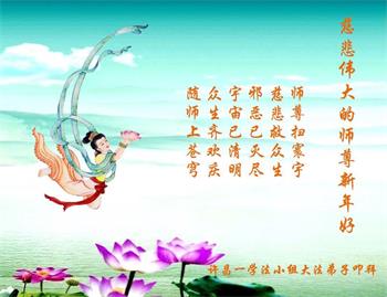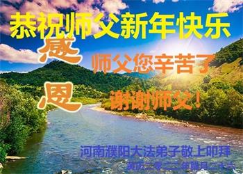 师尊新年好! 感恩师尊对弟子和众生的无量慈悲,弟子唯有精進实修,抓紧救人,回报师恩。 洛阳市大法弟子跪拜 河南省驻马店市汝南县一大法弟子恭祝师父过年好!