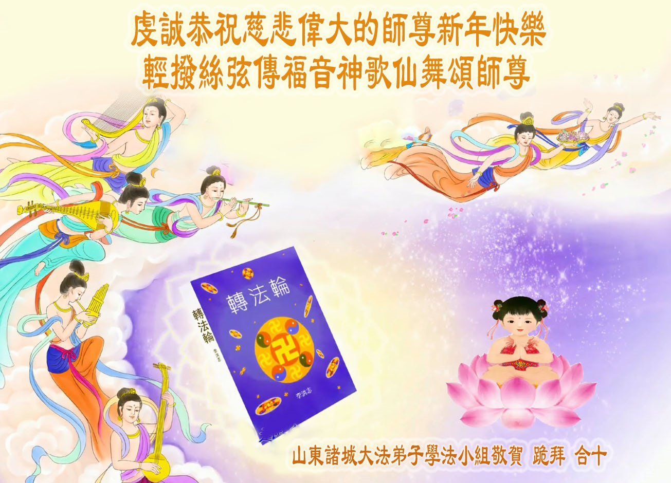 山东省诸城市大法弟子恭祝师父过年好! 师尊您好,虽然在修炼的路上磕磕碰碰,在提高心性的时候有时好、有时差一些。但我们心中有法,始终坚持师尊给我们留下的集体修炼环境。在学法中不断的提高,遇到矛盾向内找,互相配合,形成了一个整体,沐浴在佛恩浩荡的慈悲中。 在新年即将到来之际,我们学法小组全体大法弟子恭祝师尊新年快乐! 山东省潍坊市诸城市学法小组大法弟子恭祝慈悲伟大的师尊新年快乐!