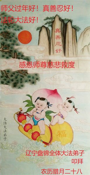 传统节日过大年 大陆学员敬师尊 问声师尊过年好 想起师尊泪沾襟 人生坎坷多苦难 大法光辉暖我心 感恩师尊慈悲度 精進实修报圣恩 辽宁盘锦大法弟子及一家人恭祝师尊新年快乐!