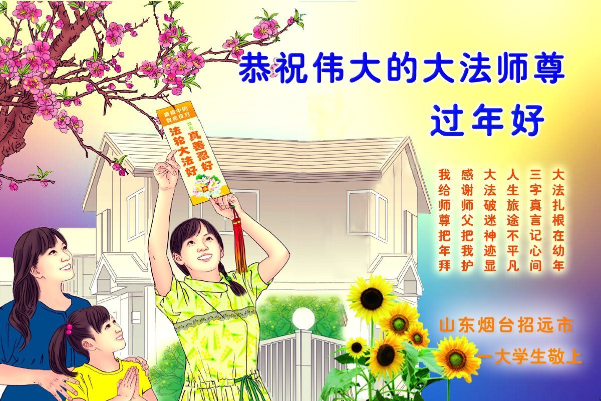 大法扎根在幼年 三字真言记心间 人生旅途不平凡 大法破迷神迹显 感谢师父把我护 我给师尊把年拜 烟台招远市一高校大学生敬上 山东省烟台市招远市一位八十岁的退休教师大法弟子恭祝伟大的师父新年好!