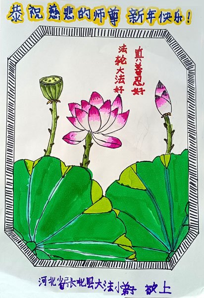 谢谢师父一直以来的慈悲看护。弟子对师父的感恩无法用语言表达,唯有在这末劫之时竭尽所能讲真相、救众生,履行好助师正法的使命。 在这新年来临之际,大法小弟子自己作了一首诗,恭祝师父新年好! 圣莲 小小天使为法来, 感恩师尊慈悲普度。 做好三件事, 返本归真回天堂, 谢谢师尊。 心中牢记真善忍, 天灾人祸碰不着, 记住法轮大法好、真善忍好。 善念一出, 小小天使在天堂。 2023年1月16日 北京大法弟子及大法小弟子恭祝慈悲伟大的师尊过年好!恭祝师父新年佳节快乐!