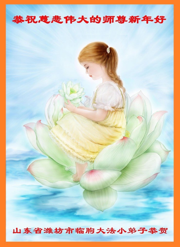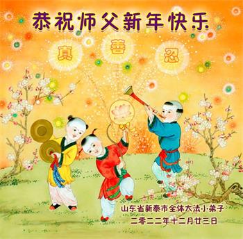 我们老少一家人恭祝师尊新年快乐!感谢师父慈悲救度! 小外孙和小孙女虽然很顽皮,但对师父很尊敬,有好吃的要先给师父吃。第一次盘腿打坐就看到了美妙的景象:莲花、五颜六色的球状神通和柱状神通、龙凤鹤等,很是惊奇欢喜。也想成为大法小弟子,但知道自己太顽皮,管不住自己,怕给师父丢脸。我们老少一家人恭祝师尊新年快乐!感谢师父慈悲救度! 全家人叩拜师父 2023年1月15日 山东威海市一学法小组全体大法弟子恭祝师父新年好!