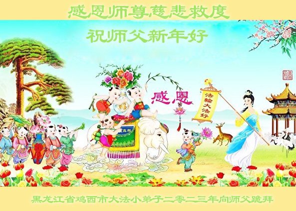 恭祝师父新年快乐!新年好!弟子们要努力按照师父说的做好三件事,学好法,发好正念,修炼好自己。在众生面临最大劫难的现在,我们全力按照师父的期盼,讲真相,多救众生。恭迎师父早日回家乡!感恩师父慈悲苦度!弟子替明白真相得救的众生谢师恩!谢谢师父慈悲救度!弟子和大法小弟子孙子同修跪拜师父! 长春市大法小弟子和奶奶大法弟子敬上 大陆大法小弟子恭祝师尊新年快乐!