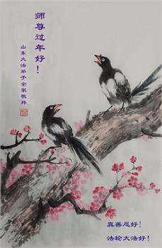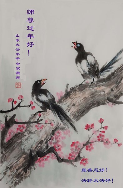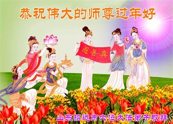 尊敬的师尊您好!师父您辛苦了! 弟子们感恩师尊的无量慈悲! 师尊为了更多的众生得救,为了成就大法弟子,用巨大的承受和付出延续着时间。我们一定珍惜师父赐给我们的一切机缘,在大淘汰来之前的有限时间里,抓紧救人,做好三件事,修好自己,兑现誓约,让更多的人明白“法轮大法好,真善忍好”,破除中共的谎言,选择光明美好的未来。跟师尊回自己真正的家。 山东大法弟子全家恭祝师尊过年好!
