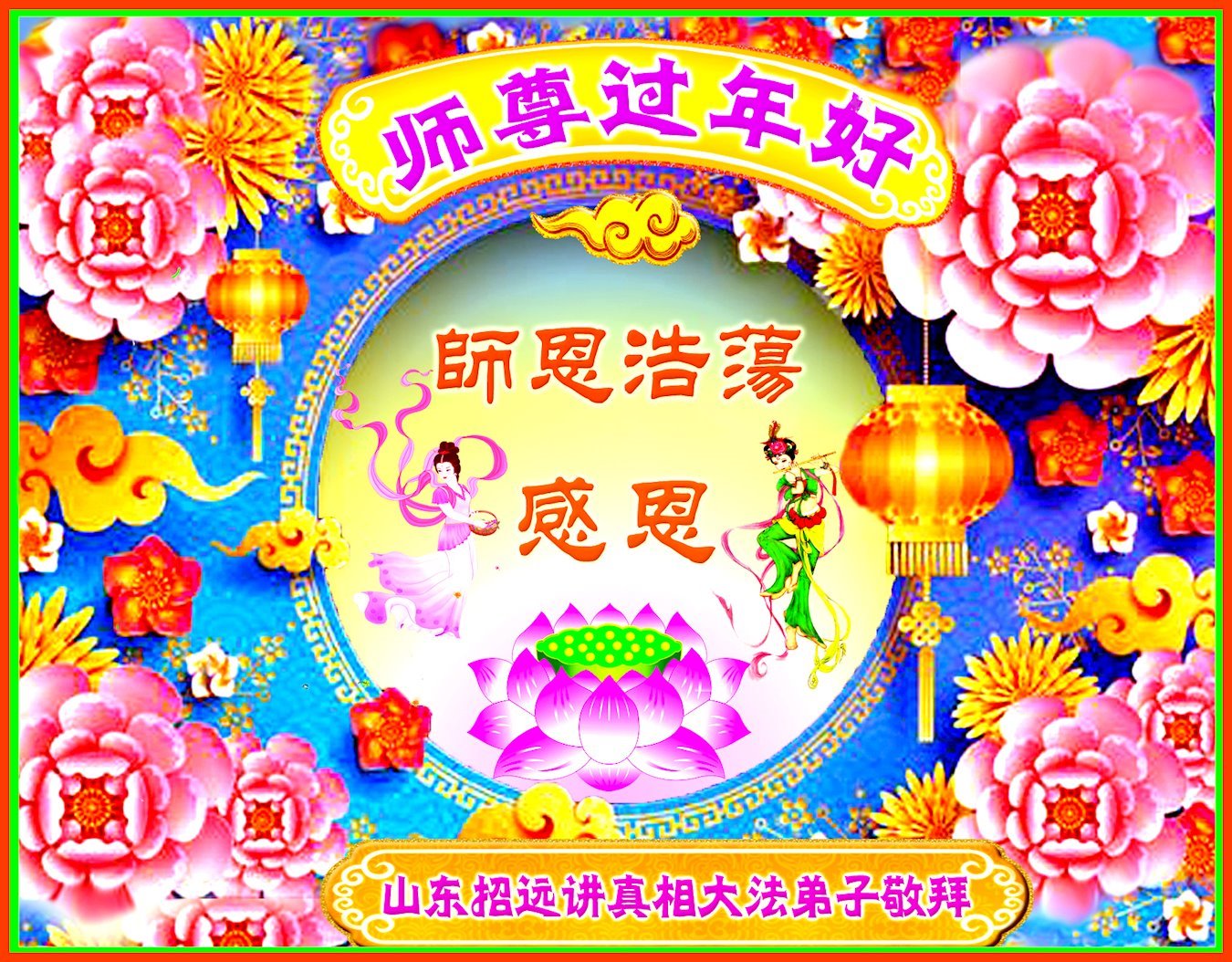 师尊过年好!感谢师尊救度之恩,弟子要做好三件事,广传真相,让世人明白真相,得到大法的救度。请师父放心。 山东省烟台市龙口市大法弟子恭祝师尊过年好!