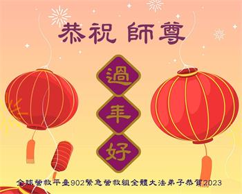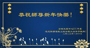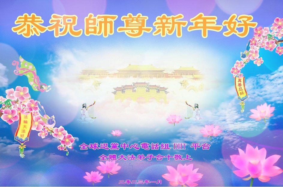 二零二三年中国新年来临之际,弟子们叩拜慈悲伟大的师尊:恭祝师尊新年快乐!感恩师尊慈悲救度! 在新的一年里,弟子要更加坚定的信师信法,认真学好法,精進实修,不忘初心,做好三件事,多救人,不辜负师尊赋予我们的神圣使命,不辜负众生的期望。 全球.退:党!中心电话组DHT平台两位大法弟子叩拜 二零二三年一月十七日 全球营救平台902营救组大法弟子恭祝慈悲伟大的师父过年好!
