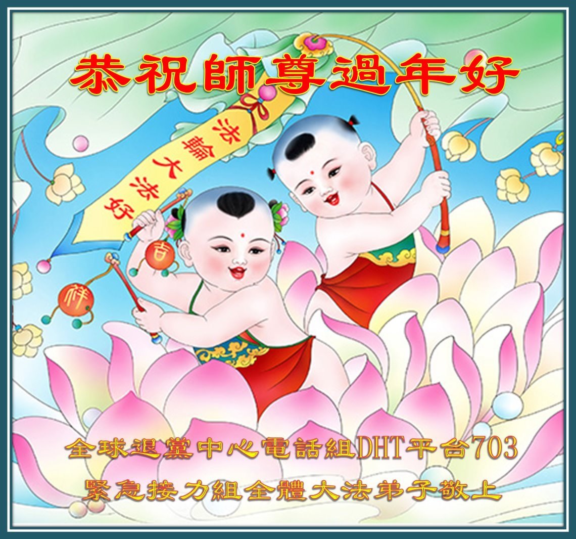 恭祝慈悲伟大师尊过年好! 全球.退:党!中心电话组DHT平台703紧急接力组全体大法弟子敬上 全球电话组DHT平台711-2学法组大法弟子恭祝慈悲伟大的师尊新年快乐!