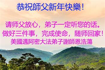感恩师尊慈悲救度! 我们要学好法、做好三件事,精進再精進。让师尊多一份欣慰,少一份操劳。 旅居美国的广东佛山大法弟子全家恭祝慈悲伟大的师尊过年好!