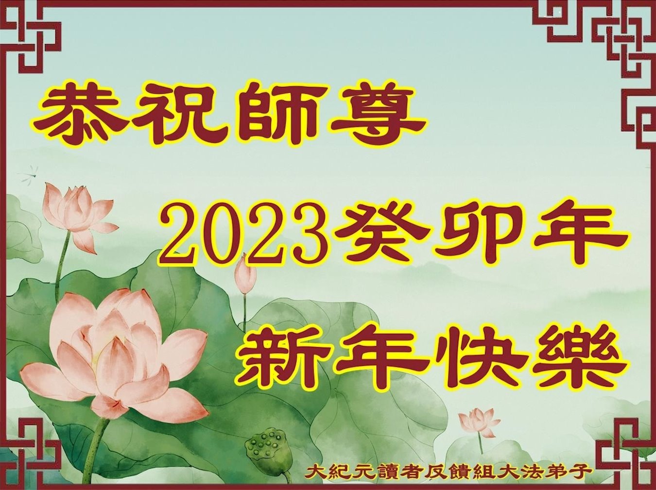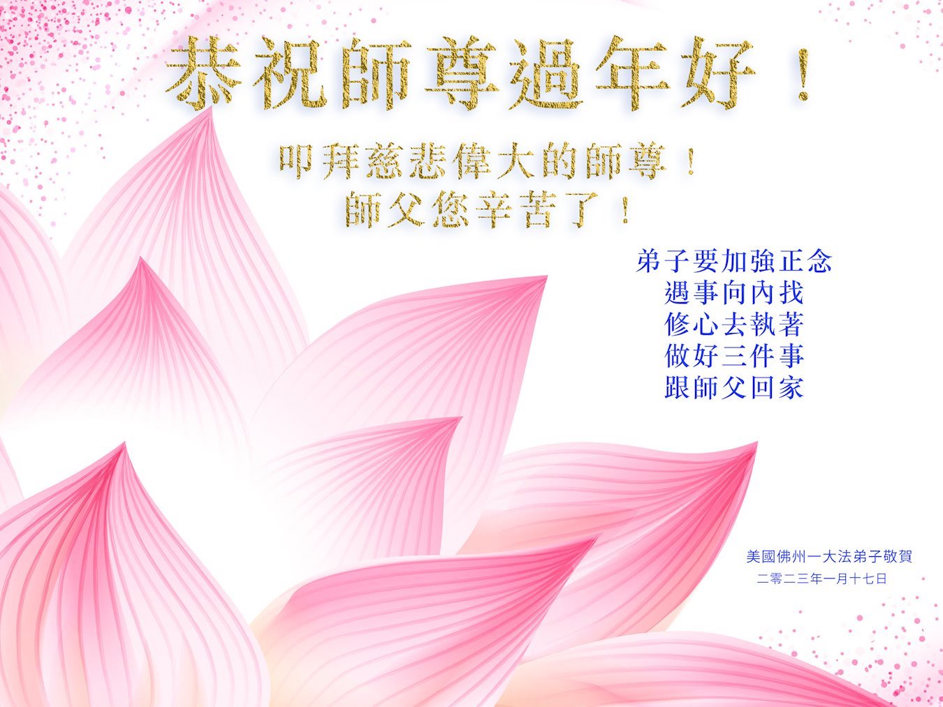 师父您辛苦了!弟子们感恩师尊慈悲救度,我们一定多学法,修好自己,多救人, 走好最后的路,跟师父回家! 全球营救平台美国组全体大法弟子敬贺 二零二三年元月 北美一大法弟子恭祝伟大的师尊中国新年快乐!