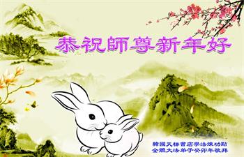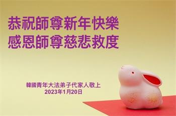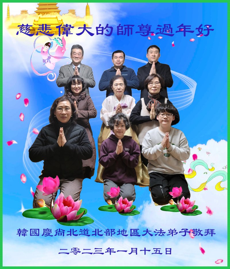 【明慧网二零二三年一月二十二日】癸卯年新年来临之际,韩国首尔、庆尚北道、釜山市、富川、光州、全罗北道、天安市、大邱、安养市、安山、仁川、市水原、世宗市、大田市大法弟子给师尊拜年! 韩国庆尚北道西部地区大法弟子恭祝慈悲伟大的师尊过年好!
