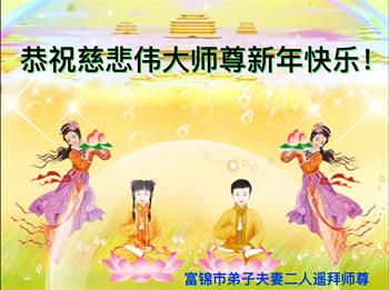 弟子及家人同修给师父拜年,师父过年好! 感恩师父的慈悲救度和时时的保护,弟子一定多去人心,放下自我,配合整体,修好一思一念,做好三件事,跟师父回家。 汤原大法弟子及家人同修叩拜 黑龙江省佳木斯市富锦市夫妻大法弟子恭祝师父新年快乐!