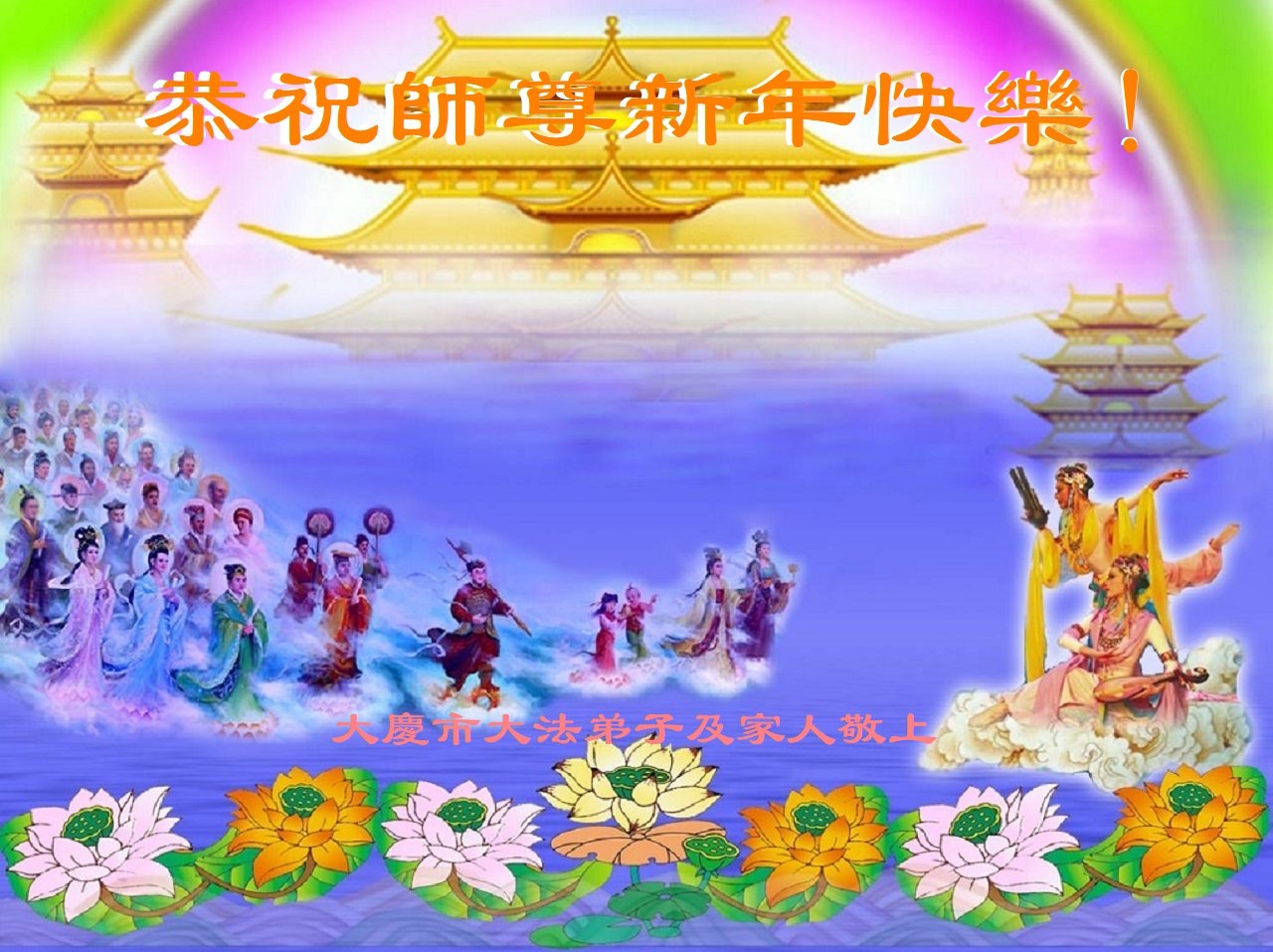 恭祝慈悲伟大的师父过年好!盼望师父早日归来。 黑龙江省大庆市东风新村开发区大法弟子 黑龙江省大庆龙岗一学法小组大法弟子恭祝师尊过年好!