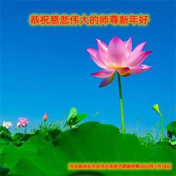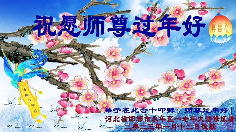2023年农历新年到来之际,我们叩拜师父! 感恩师父对弟子们及世人的保护!师尊为救度众生,用您巨大的承受和付出为我们在承受着一切!弟子们深深感受到师父每时每刻都在看护着我们!我们决不辜负师尊的期望!听师父的话,做好三件事!圆满随师还! 河北省沧州市盐山县全体大法弟子敬上 河北一老年大法弟子感恩师父、恭祝师父过年好!