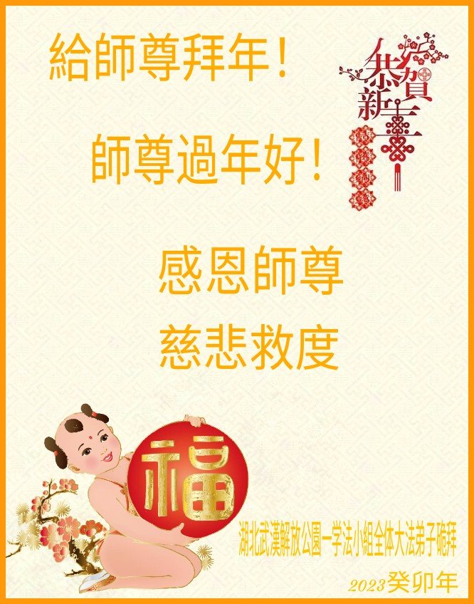 癸卯年新来临之际,弟子无比想念师尊,无比感恩师尊的慈悲保护,恭祝慈悲伟大的师尊新年快乐!在新的一年里,弟子将牢记师尊的教导,做好三件事,学好法、提高心性,抓紧时间救度世人,跟随师尊回家。 武汉市管理咨询行业一大法弟子叩拜师尊。 湖北省武汉市洪山区一大法弟子及家人恭祝师尊新年好!