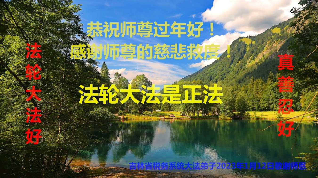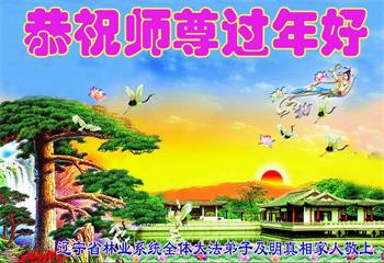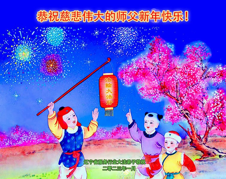 | 【明慧网二零二三年一月二十二日】(明慧网记者综合报道)2023年中国传统大年到来,中国大陆工作在各个行业的大法弟子们,在疫情蔓延之时,更加感恩师父对大法弟子们的看护和对众生的珍惜,更加感到大法弟子身负使命的重大,传真言,救众生,让更多的众生走入美好的未来。 大法正微洪 新宇铸金宫 层层法光耀苍穹 师恩永传颂 恭祝师尊过年好! 下面是部份来自中国大陆教育、财务、银行、重型机械、农垦、铁路、交通、建材工业、矿业、会计、油田、新闻界、医疗卫生、供销、石油化工、音乐界、商业、电力、科研、黄金、水利、航天航空、金融、林业、服务行业、家政、纺织、疾控系统、外交、农业、税务、船舶重工、公安局、检察院、法院、政府部门、军队、炼油、森工、高校、文艺、邮政、汽车配件、燃气、外贸、保险、文卫、环境艺术、建筑、电商、地勘、出版发行、IT行业、宣传、公用事业、外资企业、工程师、房地产、勘察设计、审计等60余行业和系统的大法弟子遥寄师父的贺词。 长春榆树市水利系统大法弟子恭祝师父过年好!