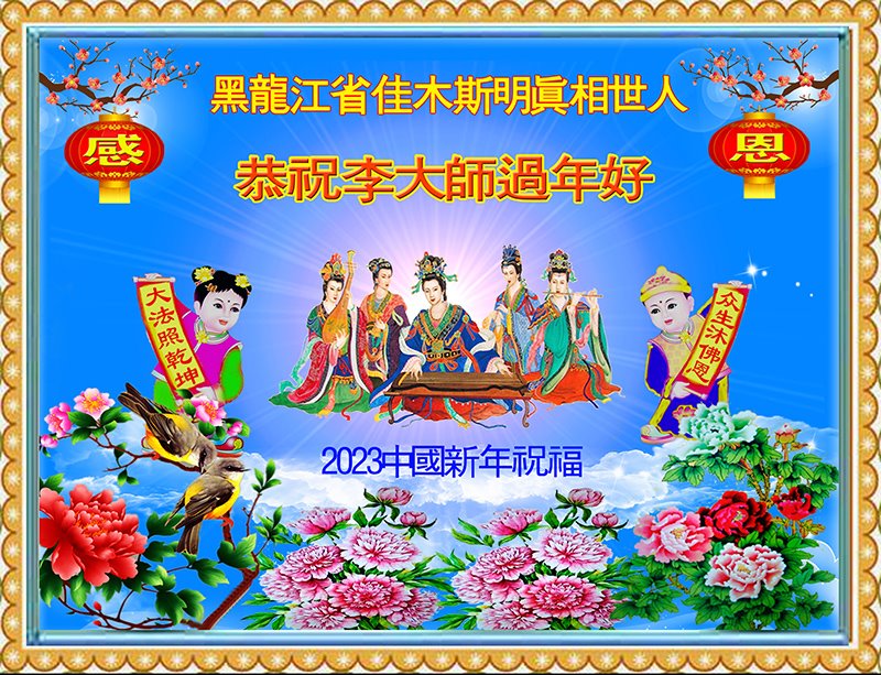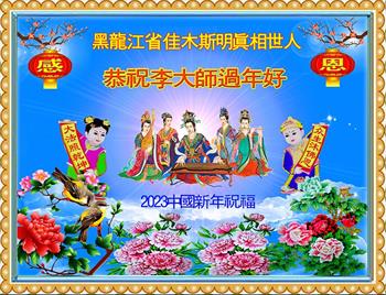 | 【明慧网二零二三年一月二十二日】沉重的2022年已逝去,新的一年来到了。越来越多的中国民众体悟到,了解法轮大法真相,念诵真言,退出中共党、团、队组织,是走出劫难的灵丹。在中国传统新年到来之际,深受大法福报的民众敬祝李大师过年好! 黑龙江省绥化市一位市民说:“在这纷纷乱世中,作为大法弟子的家人,我们都明白真相,深知就大法师父能救我们,所以诚恳接受大法弟子的忠告:危难面前诚心敬念‘法轮大法好,真、善、忍好’,我们都是大法受益者。” 山东省德州市市民写道:“接到(大法)真相护身符的老人们明白真相后,坚持念‘法轮大法好,真善忍好’,身体硬朗的很;在这次大规模的疫情爆发时,安然无恙。我们心里知道是大法师父在保护。” 黑龙江省佳木斯富锦市大法弟子家人与亲朋好友恭祝师父过年好!